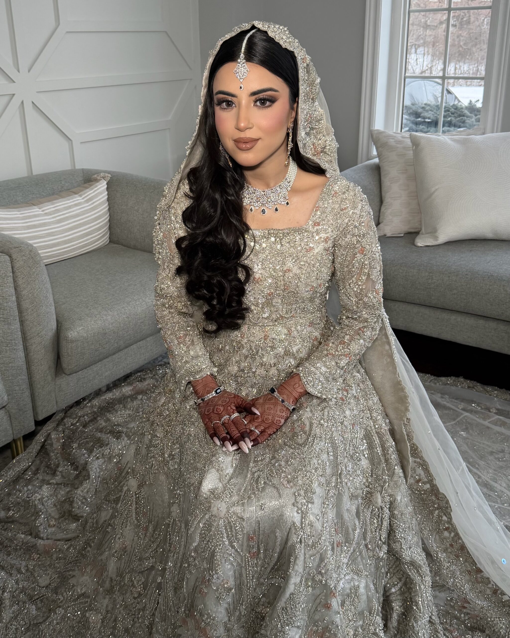 Includes hijab styling with a bun, jewelry, and dupatta setting.